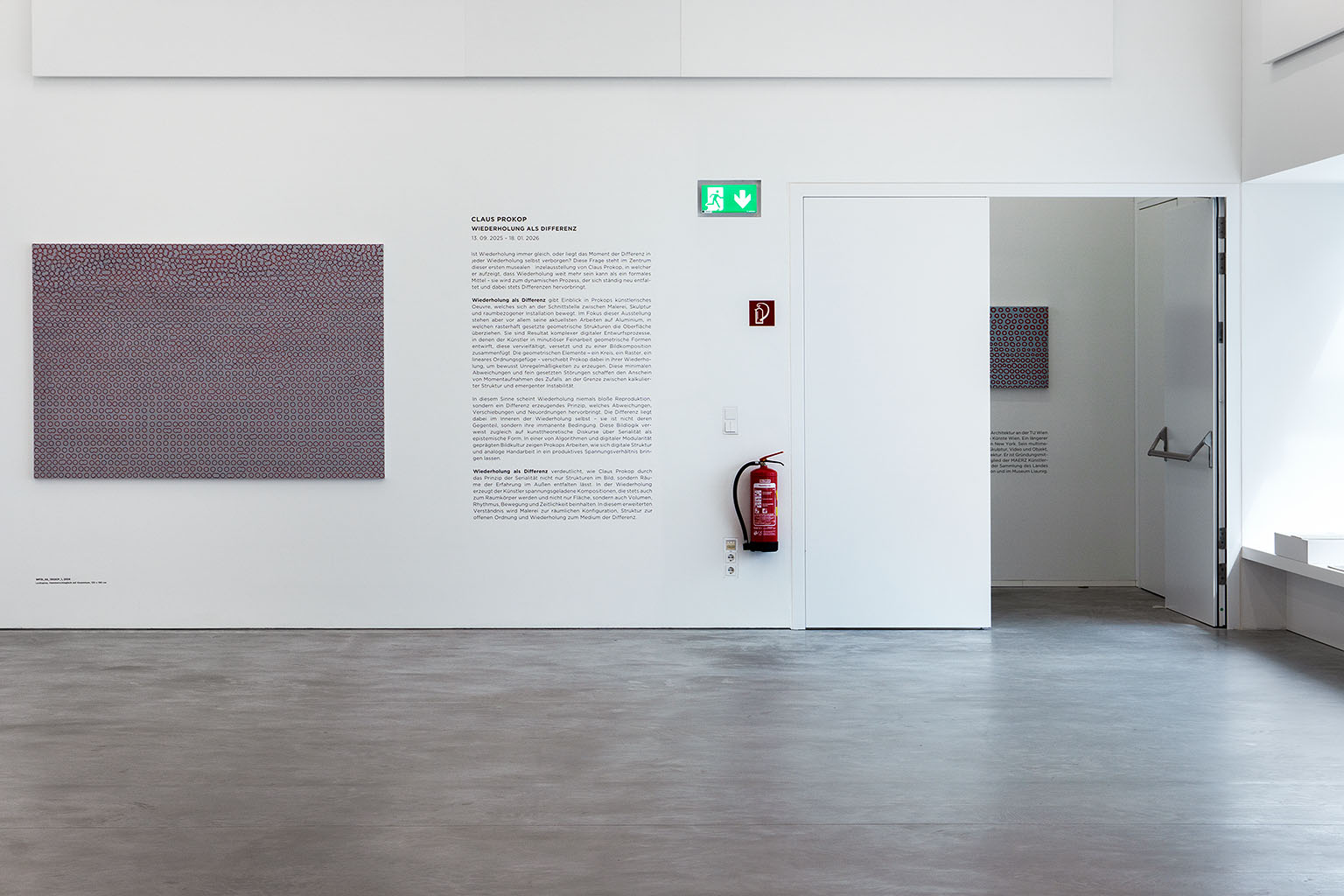Das Museum Angerlehner zeigt mit Wiederholung als Differenz die erste museale Einzelausstellung des österreichischen Künstlers Claus Prokop. Im Zentrum stehen dabei seine neuesten Werke auf Aluminium, in denen der Künstler ein komplexes Spiel aus Wiederholung und Variation entfaltet, geometrische Formen vervielfältigt und durch Überlagerungen und bewusste rhythmische Störungen zu visuell vielschichtigen Bildkompositionen verdichtet.